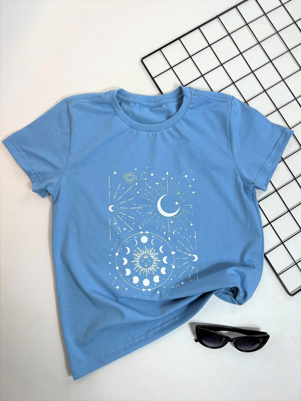 O azul suave adiciona um toque de serenidade, enquanto a estampa transporta você para uma jornada cósmica. Vista-se com esta camiseta e deixe a misticidade se tornar parte do seu estilo diário.