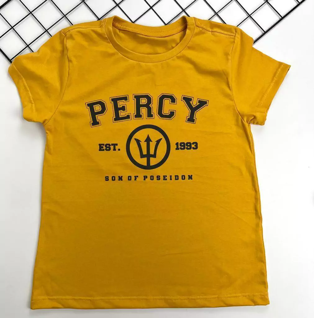 Interesse-se pela estampa em preto, destacando a palavra "PERCY est 1993 son of Poseidon". Um toque estiloso que canaliza o poder do mar.